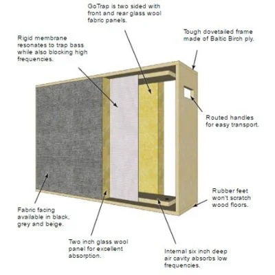 The GoTrap features a Broadway fabric covered high-density glass wool acoustic panel mounted on each side to effectively absorb the sound. This is augmented with a heavy internal MDF board that adds mass to help contain spill between instruments. The MDF board also acts like a low frequency resonator that combines with the acoustic panels and the deep internal air cavity to absorb bass down to 75Hz.
